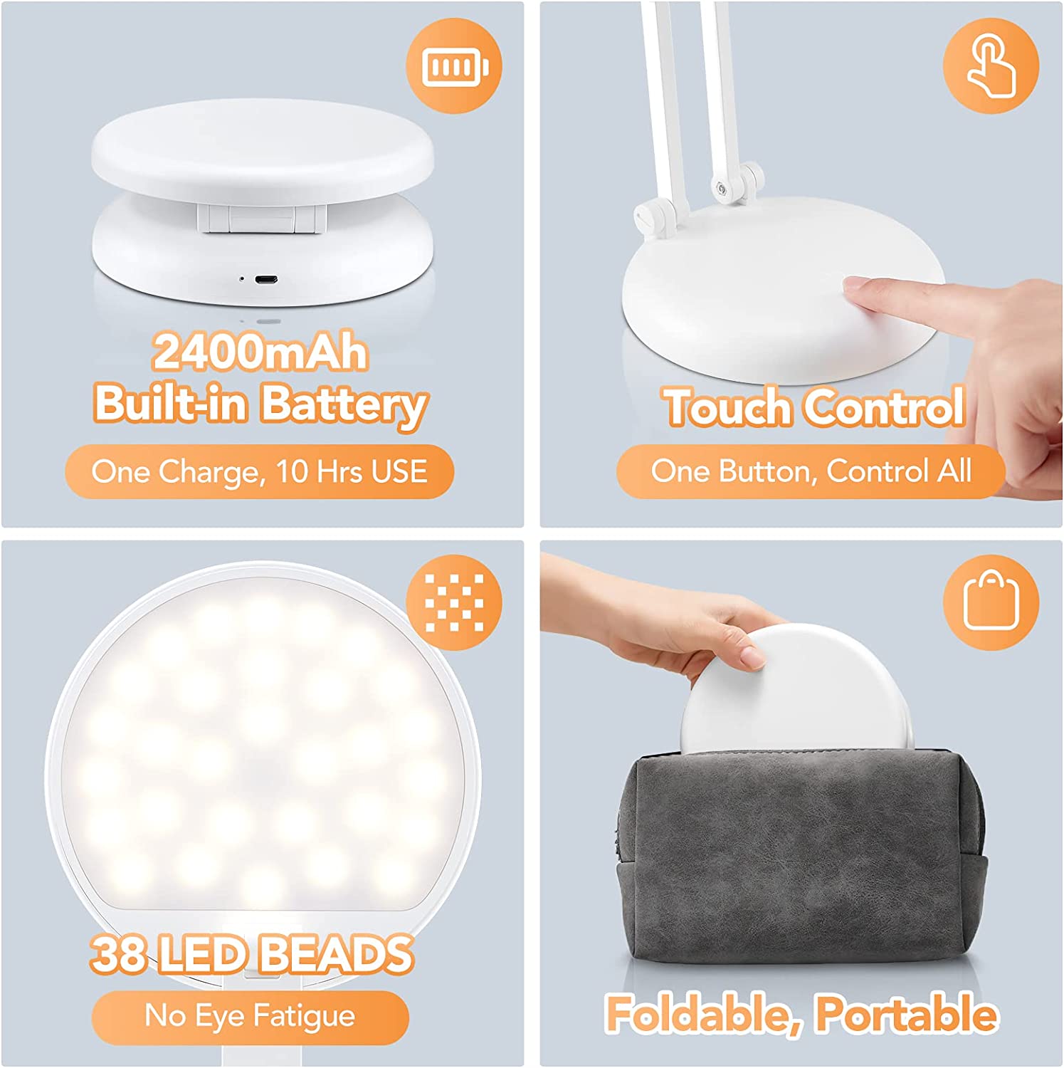 - BATTERY OPERATED LAMP RECHARGEABLE LAMP: 2400mAh BUILT-IN BATTERY: The small desk lamp has a built-in battery which supports 5-week(max). Once charged, u can take the battery operated lamp small lamp around, it’s RECHARGEABLE LAMP & PORTABLE LAMP! When folded, the small desk lamp becomes a small lamp “cookie”, which can be tucked into bag, u can take small lamp “cookie” anywhere. A battery operated lamp, portabl lamp & rechargeable lamp! The LED desk lamp is battery operated lamp once charged!